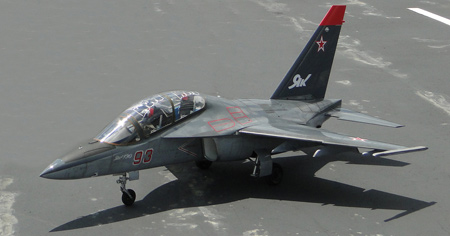 Wingspan: 79" There have been 3 prototype models built and flown. They were flown and displayed at Kentucky Jets, Super Jets South, and 12 O'Clock High. The YAK-130 won prestigious scale and flying awards at all three events. The BVM staff has worked closely with representatives of the factory staff to bring to market a product worthy of the BVM brand name. About 150+ successful flights have been accomplished allowing us to evaluate the engine installation, fuel system, pneumatic systems, landing gear and door systems, control travels, center of gravity, gyro application, etc. A typical BVM manual has been prepared to allow you to apply 12-15 hours of hobby time to prepare the YAK-130 for flight. The price of the YAK-130 is $7,950.00. You add radio receiver, batteries, BVM U.A.T., pilot, and a 140 class engine. The Plug and Play features of the YAK are very similar to the BVM F-16 and Cougar.