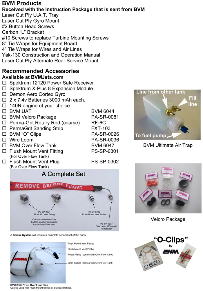 Color Schemes Available You can call Patty at 407-327-6333 and help us get your YAK-130 ownership underway. Note: David Ribbe of Flex Innovations.com has a new Aura Gyro that can be factory set for your YAK-130. Thus far, the YAK has been flown with the Aura and the Cortex Demon Gyros. BVM first flies and trims the model with no gyro assist. Then, of course, your flight presentation can be enhanced with a properly set-up gyro of your choice.